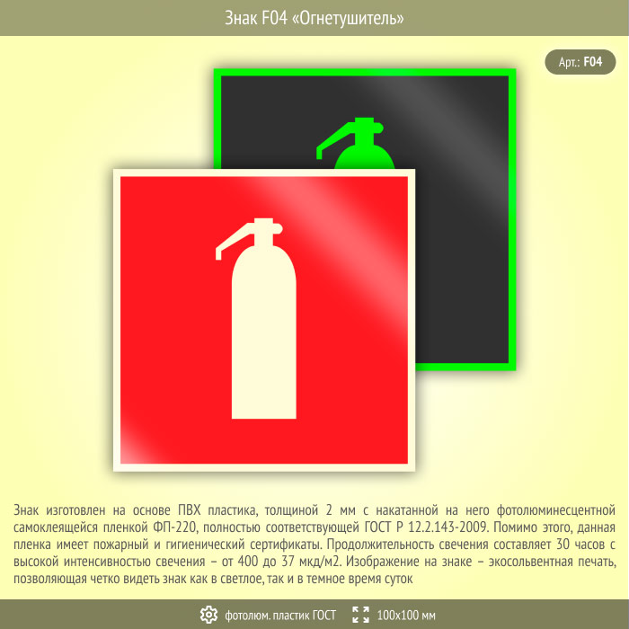Знак F04 «Огнетушитель» (фотолюминесцентный пластик ГОСТ 34428-2018, 100х100 мм) в Новокузнецке купить