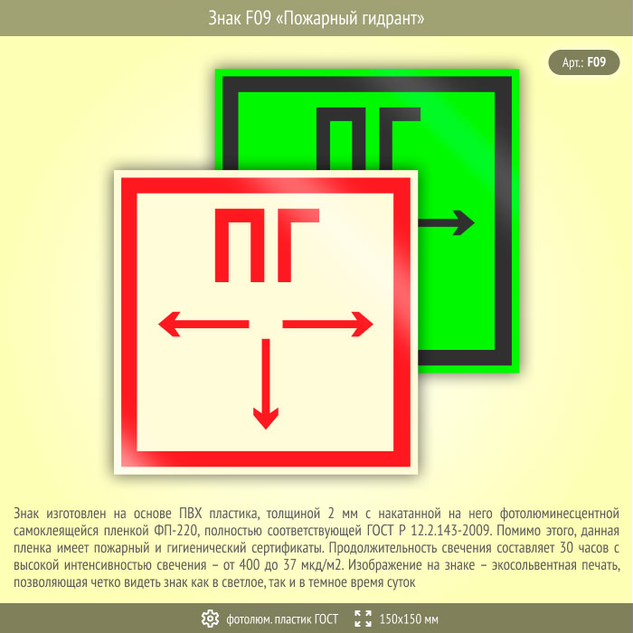 Знак F09 «Пожарный гидрант» (фотолюминесцентный пластик ГОСТ 34428-2018, 150х150 мм) в Новокузнецке купить