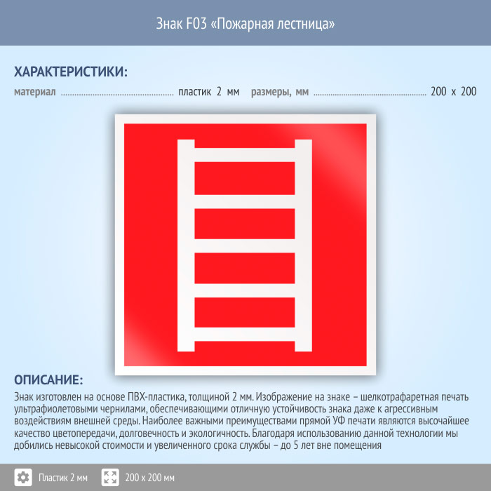 Знак F03 «Пожарная лестница» (пластик, 200х200 мм) в Новокузнецке купить