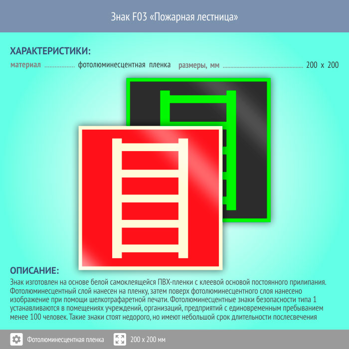 Знак F03 «Пожарная лестница» (фотолюминесцентная пленка, 200х200 мм) в Новокузнецке купить