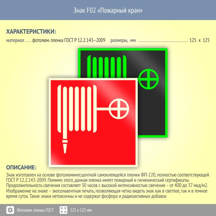 Знак F02 «Пожарный кран» (фотолюминесцентная пленка ГОСТ 34428-2018, 125х125 мм) в Новокузнецке купить