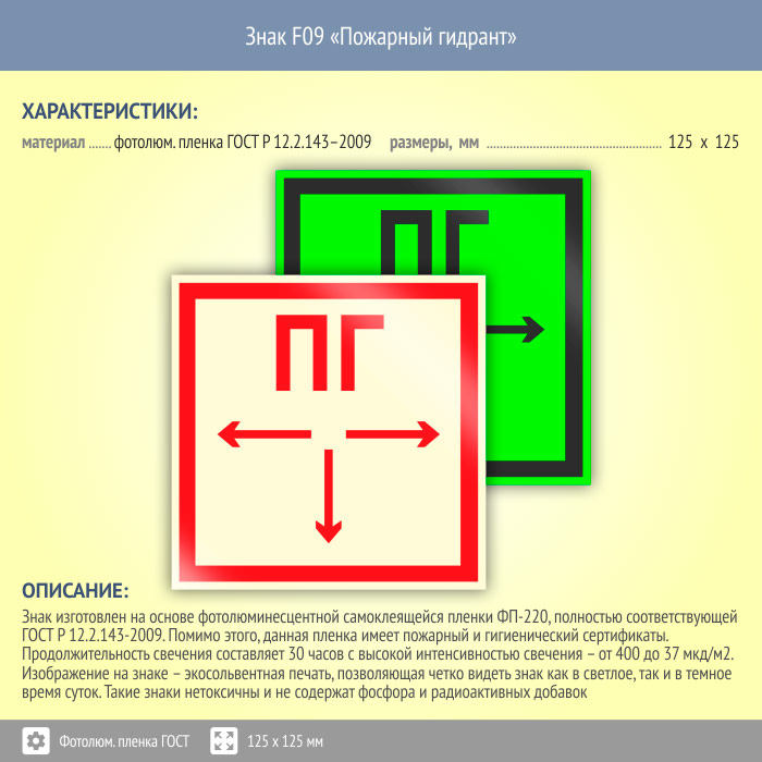 Знак F09 «Пожарный гидрант» (фотолюминесцентная пленка ГОСТ 34428-2018, 125х125 мм) в Новокузнецке купить