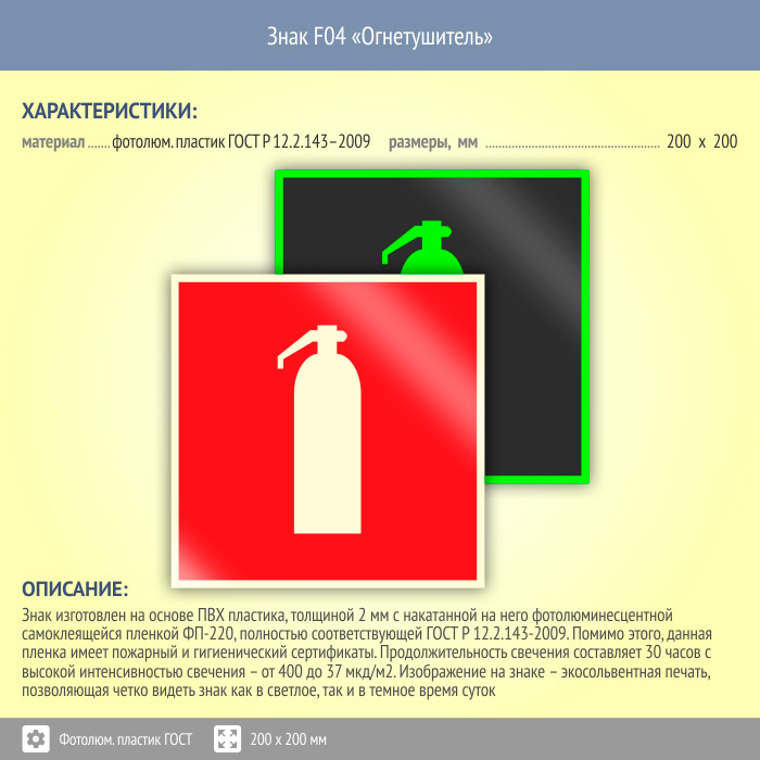 Знак F04 «Огнетушитель» (фотолюминесцентный пластик ГОСТ 34428-2018, 200х200 мм) в Новокузнецке купить
